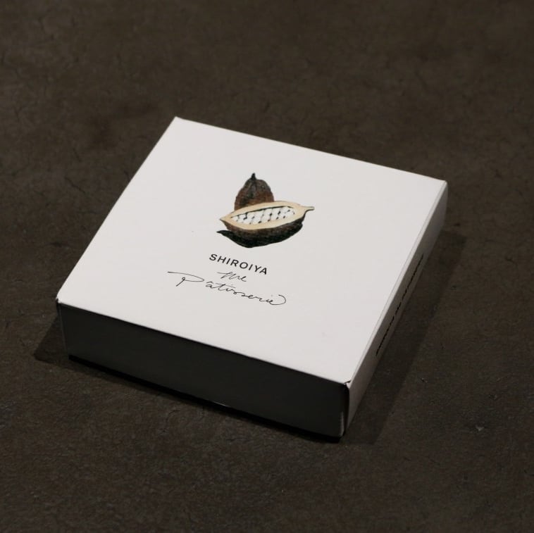 絵描きのリー・イズミダ⽒によるカカオの絵がついたパッケージに、⽩井屋ホテルのロゴを彷彿させる姿に生チョコがおさまっています。